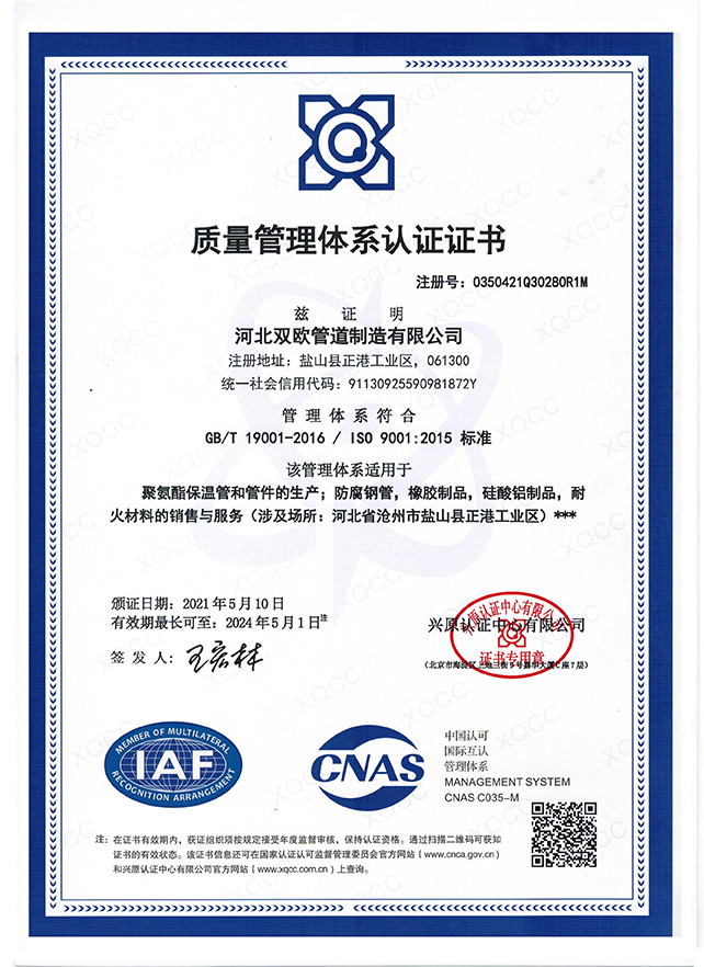 公司坐落于管道裝備制造業基地滄州市鹽山(shān)縣正港工業區,公司注冊資金1億元。占地面積56800平米,本公司是集設計(jì)、生(shēng)産、銷售、施工爲一體(tǐ)的企業,多年(nián)來(lái)公司堅持“質量優良、客戶爲本”的人(rén)性化經營理(lǐ)念,産品順利通過ISO9001:2015國(guó)際質量體(tǐ)系認證,并被城(chéng)鎮防腐保溫材料吸收爲會員(yuán)單位,公司産品銷往各地。